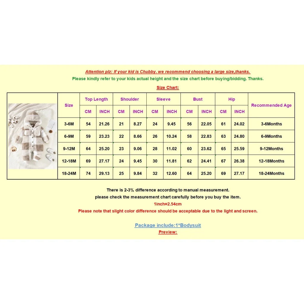 Baby Plaid Romper - Hooded Long Sleeve Plush Jumpsuit for Boys & Girls (3-24 Months)