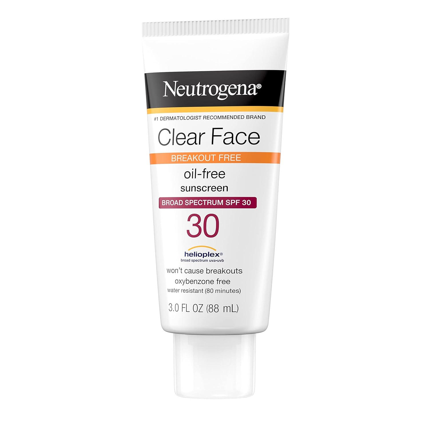 - Pack of One, 3-fluid ounce Neutrogena Clear Face Sunscreen for Acne-Prone Skin Stabilized with Helioplex technology, this oxybenzone-free facial sunscreen offers superior Broad Spectrum SPF 30 UVA/UVB protection
